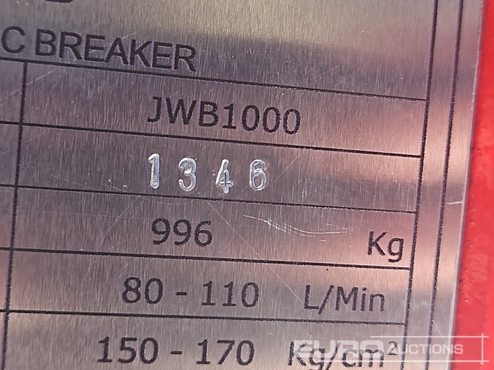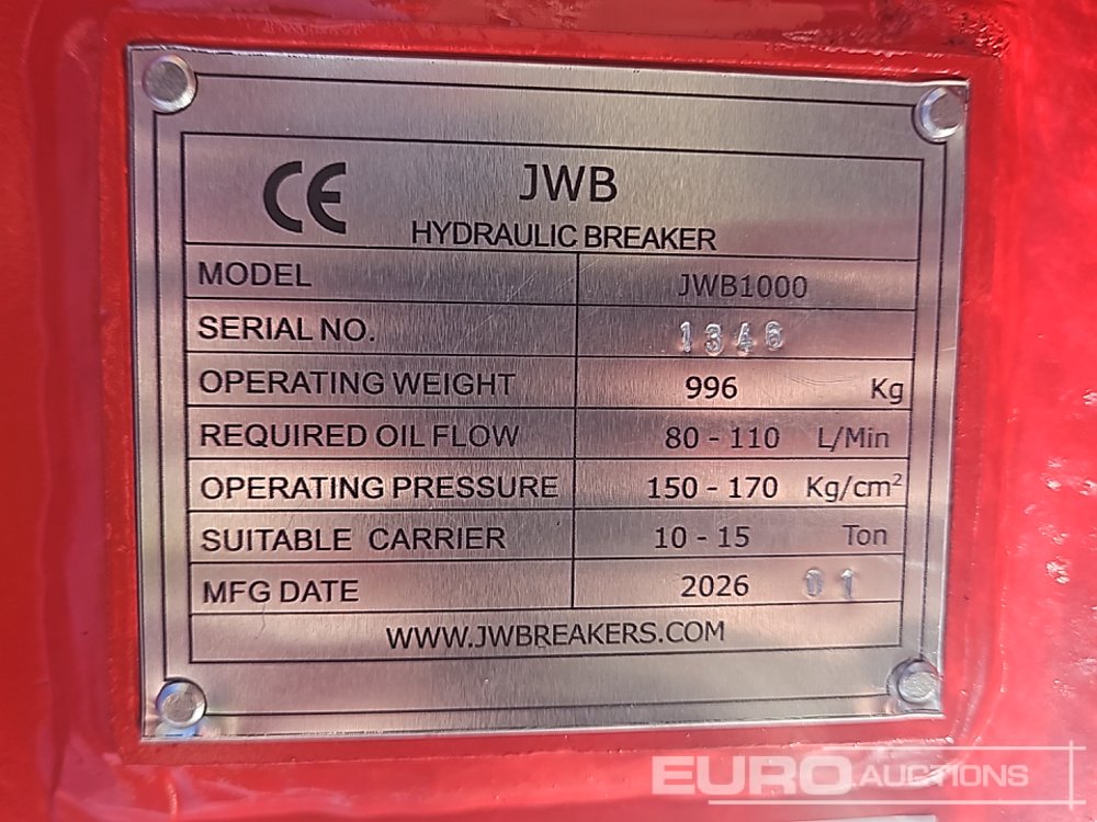 Unused 2026 JWB JWB1000 Hydraulic Breaker 65mm Pin to suit 13 Ton Excavator (Certificate of Compliance Available) - CYSB501346