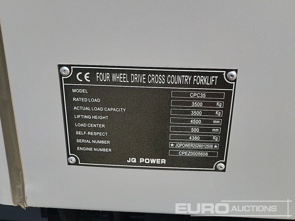 Unused 2026 JQ Power CPC35 4WD Diesel Articulated Rough Terrain Forklift, 3 Stage Free Lift Mast, Side Shift, Forks - JQPOWER2026012506