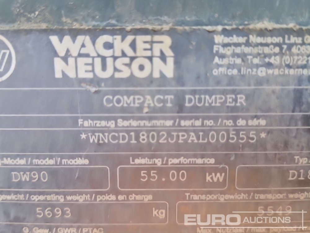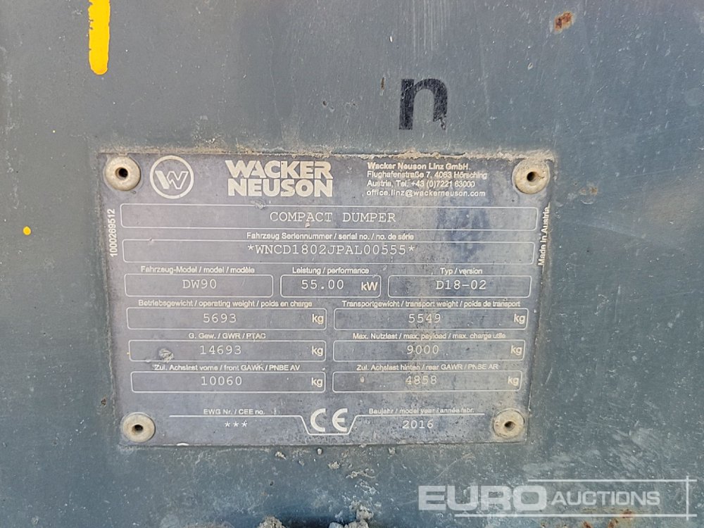 2016 Wacker Neuson DW90 9 Ton Swivel Skip Dumper, Roll Bar - BP16 LSC - WNCD1802JPAL00555