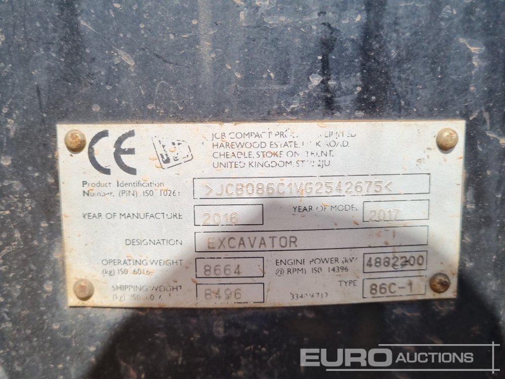 2016 JCB 86C-1 ECO Rubber Tracks, Blade, Offset, CV, QH, Piped, Aux. Piping, A/C - JCB086C1VG2542675
