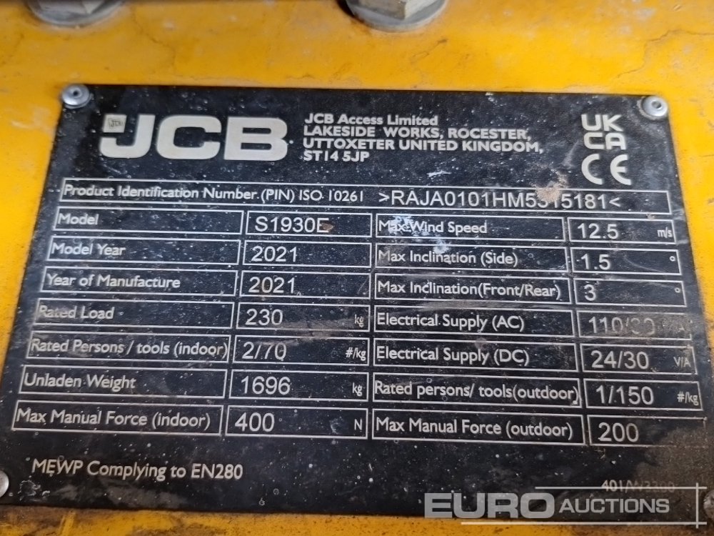 2021 JCB S1930E Electric Scissor Lift, 7.7m Working Height, 230kg Platform Capacity, Extending Deck, Power to Platform, Outdoor Rated, Non Marking Tyres (Meter Reading: 89 Hours) - RAJA0101HM5315181