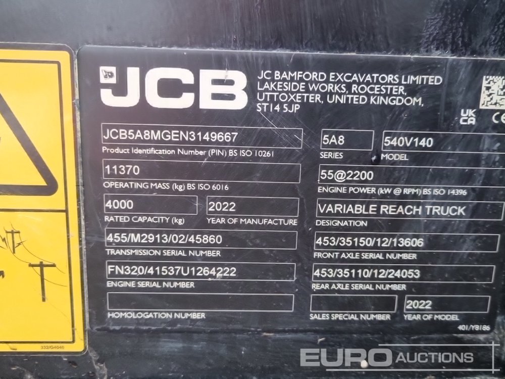 2022 JCB 540-140 Hi Viz Turbo Powershift Telehandler, Sway, WLI, Forks - RO22 CXL - JCB5A8MGEN3149667