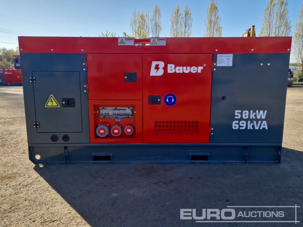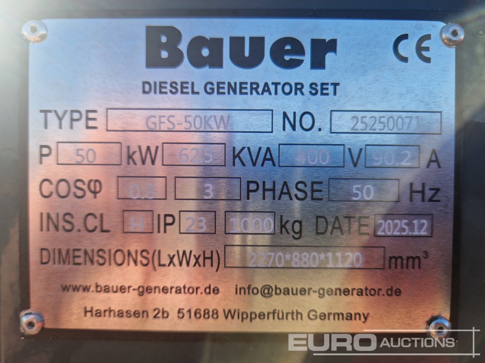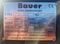 Unused Bauer GFS-50KW Static Diesel Generator, 3 Phase Conductors, 1 Neutral Conductor, 1x CE Single-Phase 16A, 1x CE Three-Phase 32A, 1x CE Three-Phase 63A, Terminal Block for Direct House Feed-In or ATS, Main Circuit Breaker, RS485 Communication CANBUS Connection - 25250071