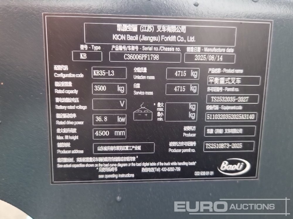 Unused 2025 Baoli KB35 Diesel Forklift, 3 Stage Mast, Sideshift, Forks - C36006PF1798