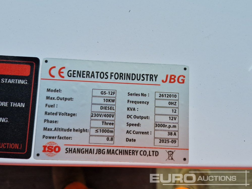 2025 JBG GS-12F 12kVA Generator, Single Cylinder Engine - 2612010