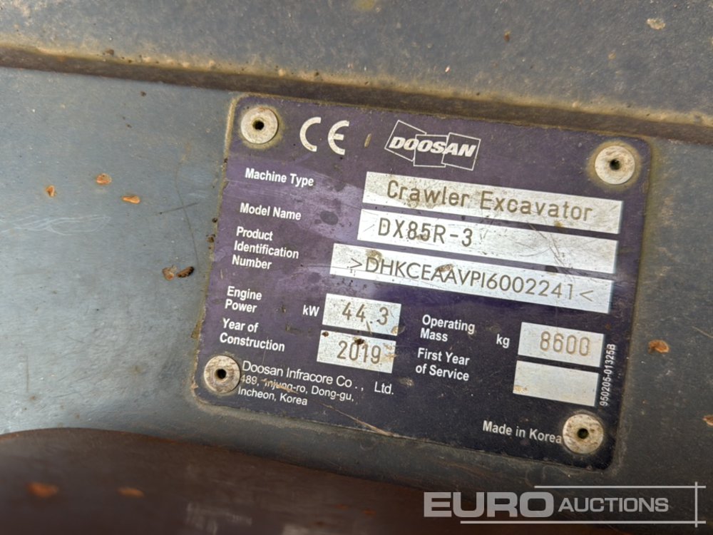 2019 Doosan DX85R-3 Rubber Tracks, Blade, Offset, CV, QH, Piped, Aux. Piping, Reverse Camera, A/C - DHKCEAAVPI6002241