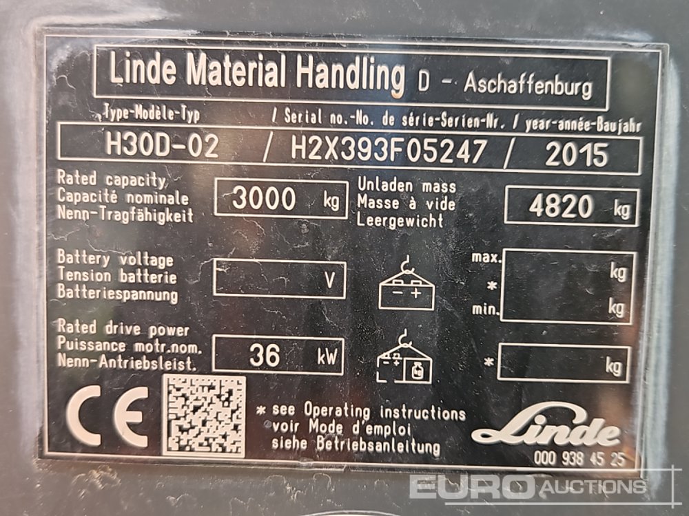 2015 Linde H30D-02 Diesel Forklift, 2 Stage Free Lift Mast (Non Runner) - H2X393F05247