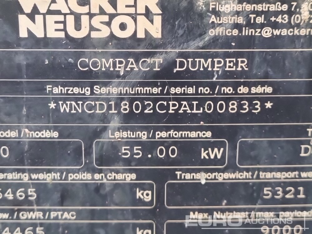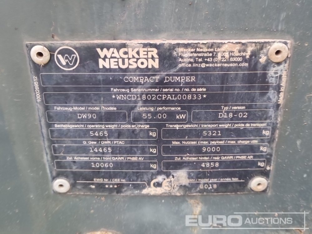 2018 Wacker Neuson DW90 9 Ton Dumper, Forward Facing Camera, Full Cab - BW67 DZZ - WNCD1802CPAL00833