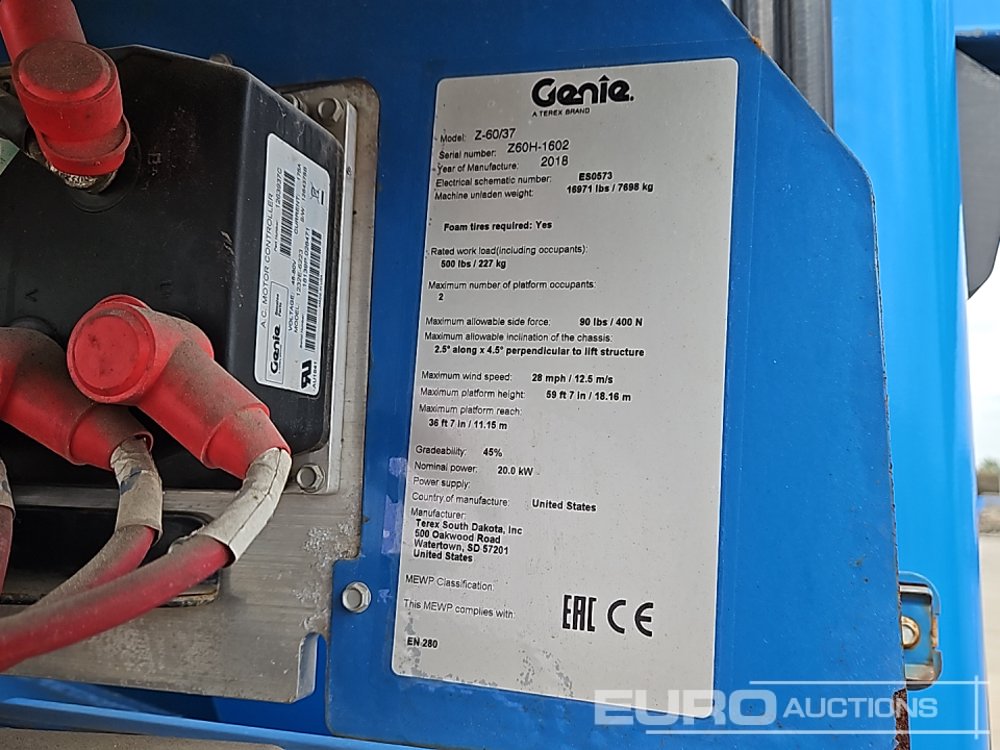 2018 Genie Z60/37 4x4 Hybrid Articulated Telescopic Boom Lift, 20.16m Working Height, 227kg Platform Capacity, Secondary Guarding, Power To Platform, Non Marking Rough Terrain Tyres (Meter Reading: 307 Hours) - Z60H1602