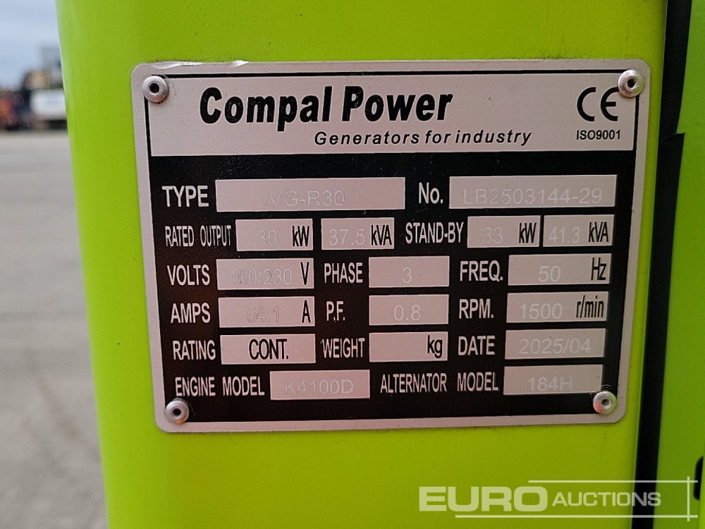 Compal Power VG-R30 37.5kVA Generator, 4 Cylinder Engine - LB250314429