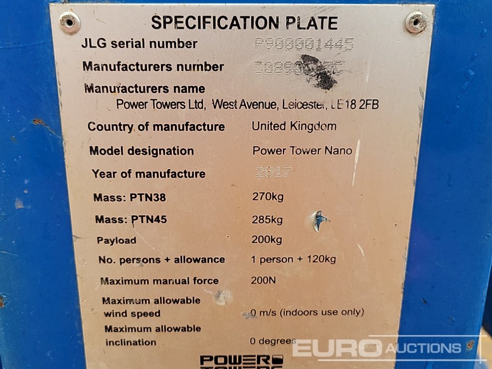 2017 Power Towers Nano Push Around Access Platform, 4.5m Working Height, 200kg Platform Capacity, Non Marking Tyres - P900001445