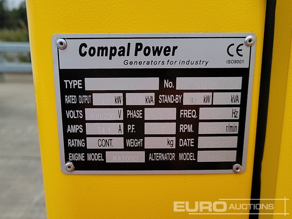 Unused 2025 Compal Power VG-R30 Twin Axle 37.5kVA Generator, 4 Cylinder Engine - 140495774