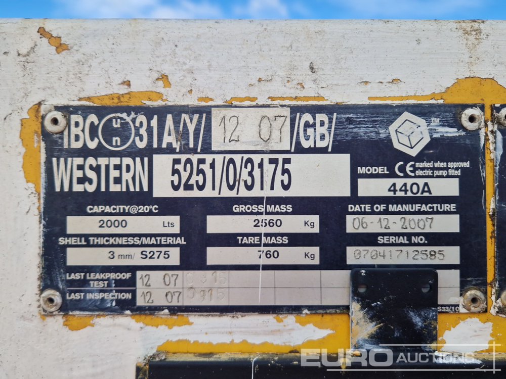 2007 Western 440A 2000 Litre Twin Axle Bunded Fuel Bowser, Manual & Electric - 07041712585
