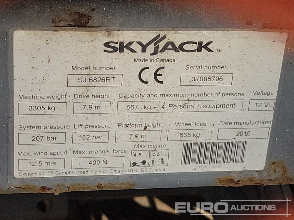 2016 SkyJack SJ6826RT 4x4 Diesel Scissor Lift, 9,92m Working Height, 567kg Platform Capacity, Extending Deck, Stabilisers (Copy of Declaration of Conformity Available) - 37006796