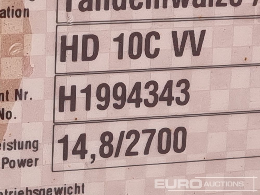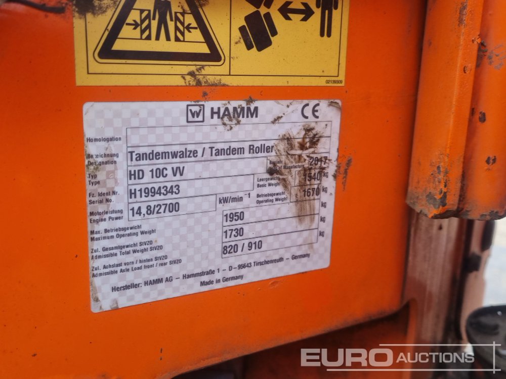 2017 Hamm HD10C VV Double Drum Vibrating Roller, Roll Bar (Meter Reading: 642 Hours) - H1994343