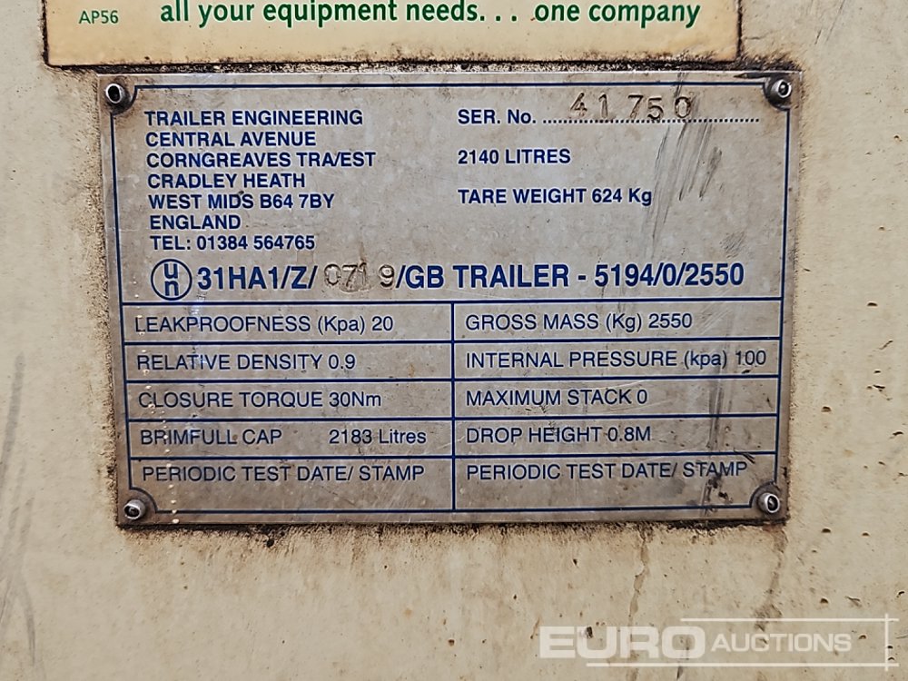 Trailer Engineering 2183 Litre Single Axle Bunded Fuel Bowser, Petrol Pump - 41750