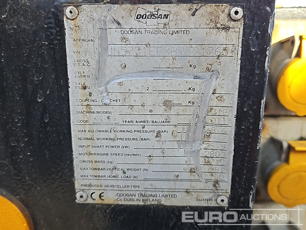 2011 Doosan 731E 105CFM Single Axle Compressor - UN5731EFXBY321765