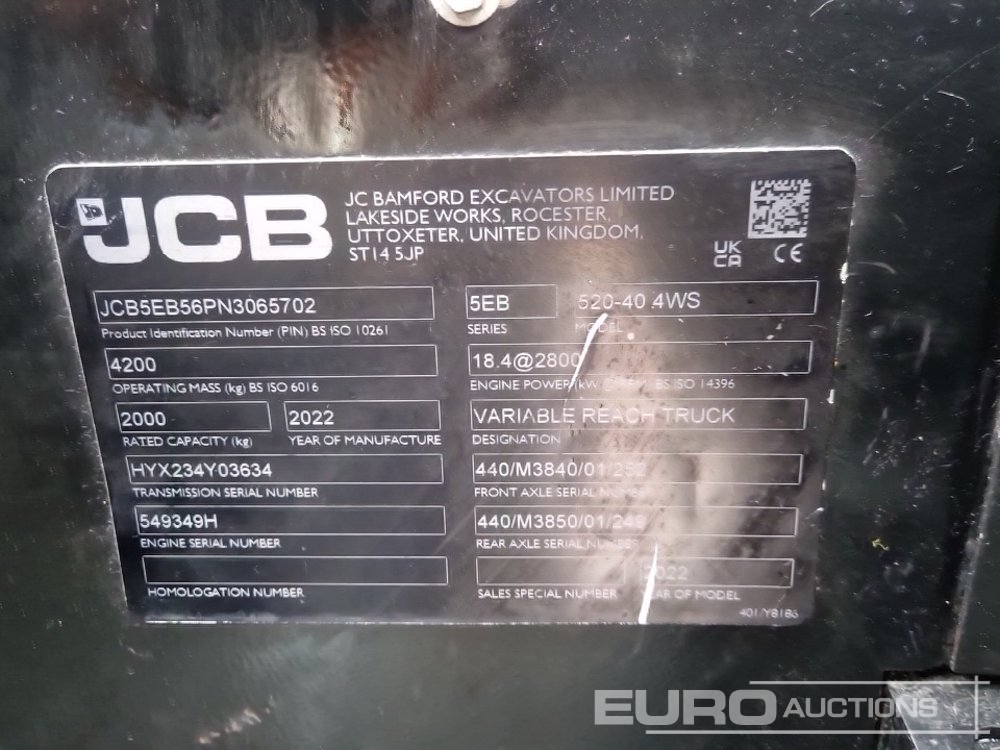 2022 JCB 520-40 Telehandler, WLI, Forks (Meter Reading: 762 Hours) - SB22 VUG - JCB5EB56PN3065702