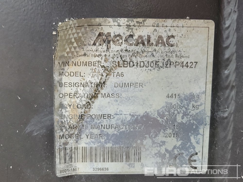 2018 Mecalac TA6 6 Ton Dumper, Roll Bar - SLBD1DJ0EJ2PP4427