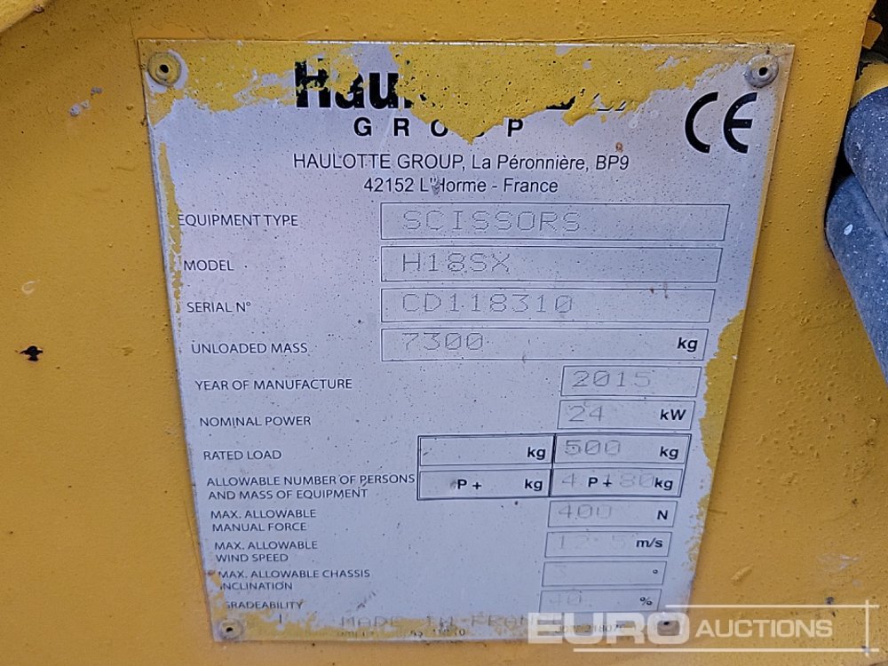 2015 Haulotte H18SX 4x4 Diesel Scissor Lift, 18m Working Height, 500kg Platform Capacity, Double Deck Extensions, Stabilisers - CD118310