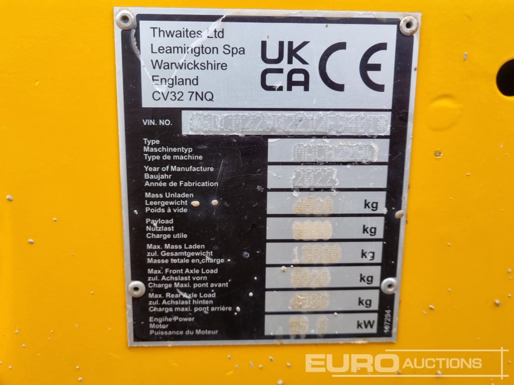 2022 Thwaites 9 Ton Dumper, Forward Facing Camera, Roll Bar (Meter Reading: 295 Hours) - SLCM22902212F9401