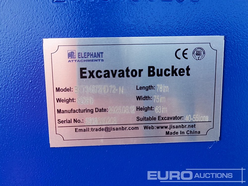Unused 2025 Elephant BKT34572HD 72-N 78" Digging Bucket 100/110 to suit 40-50 Ton Excavator - 2508060208