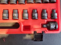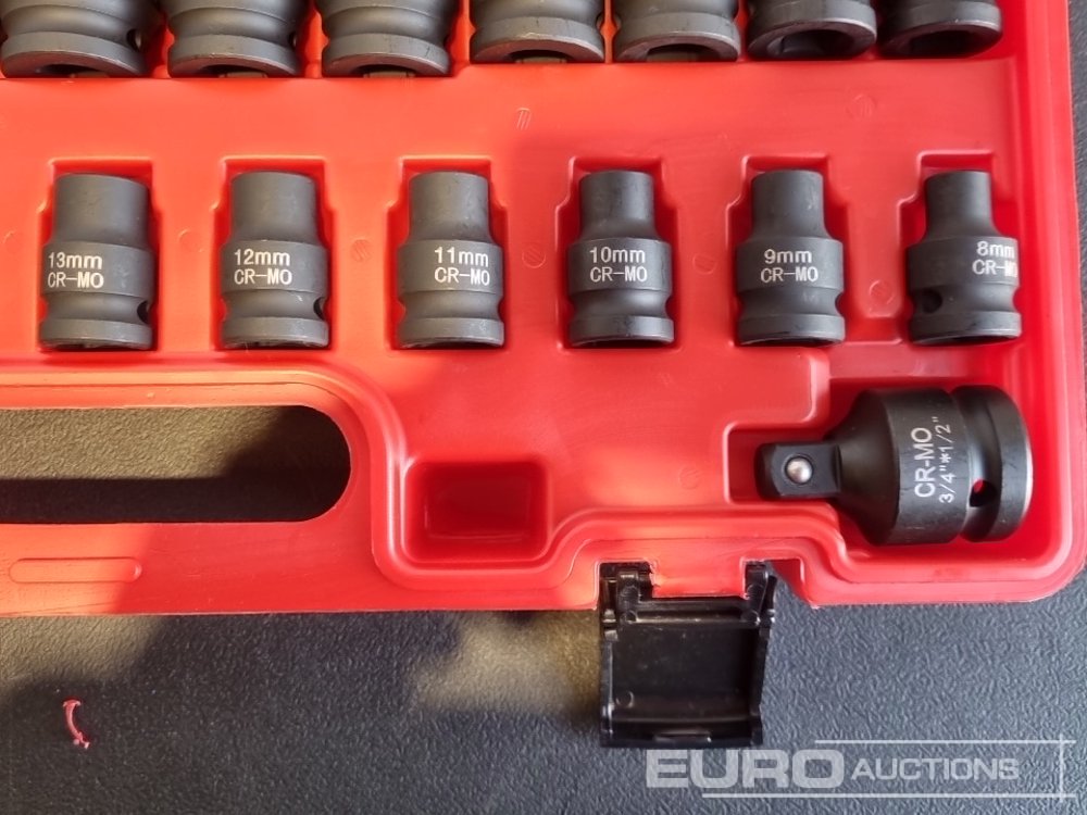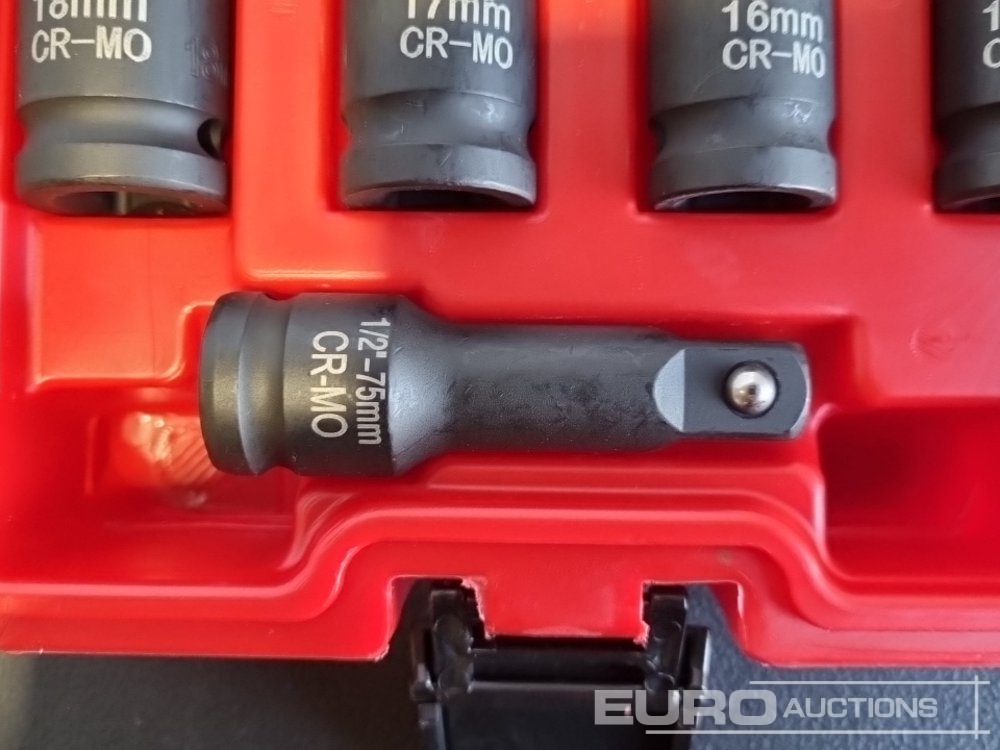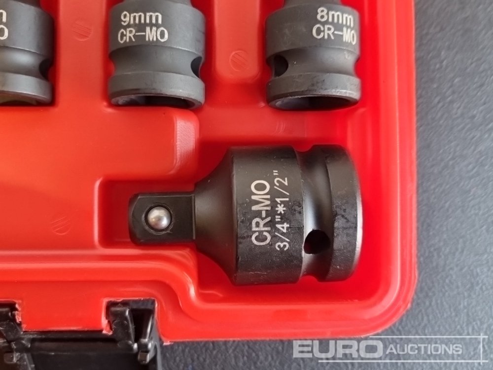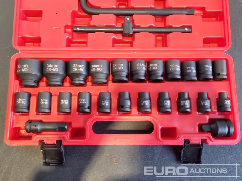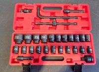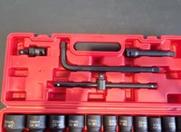 Unused 2025 Boss 1/2" 28pc Pneumatic Short Sleeve Socket Set, 3" Connecting Rod, 5" Connecting Rod Universal Joint, 10" Sliding Rod, 10" Bending Rod Adapter 3/4"-1/2"