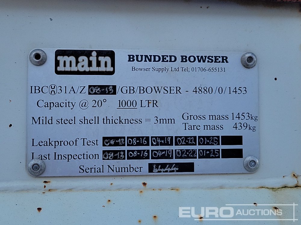 2013 Bowser Supply 1000 Litre Single Axle Bunded Fuel Bowser, Petrol Pump - 6444