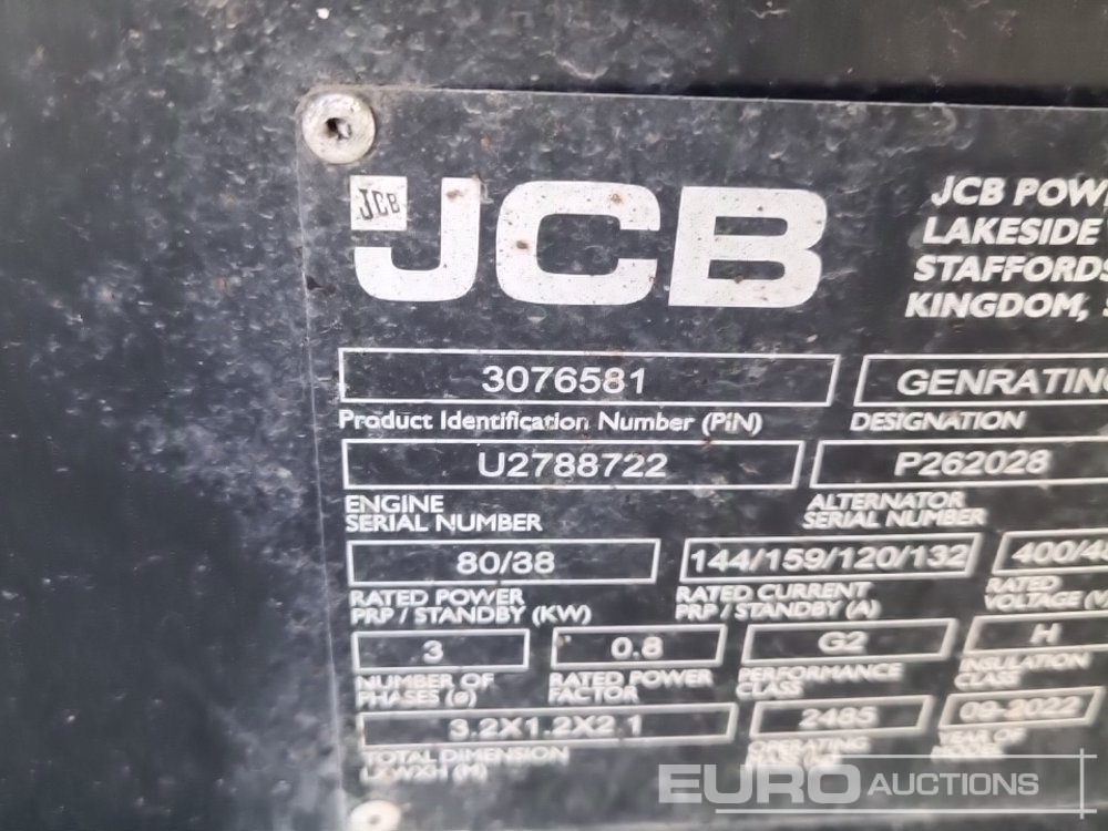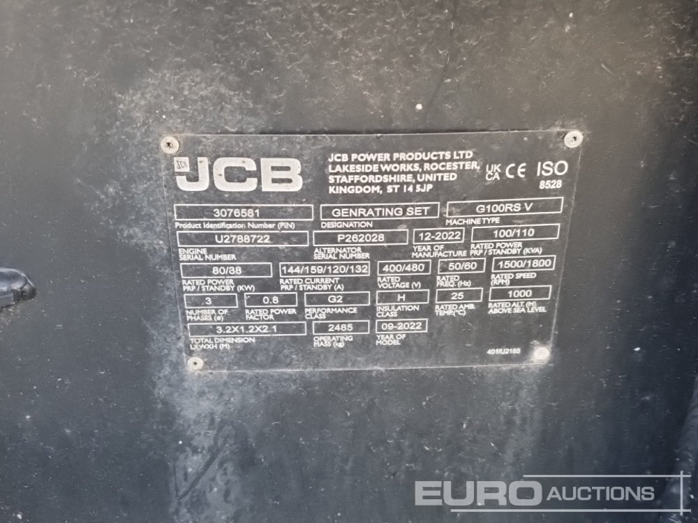 2022 JCB G100RS 100kVA Generator, 4 Cylinder Engine - 3076581