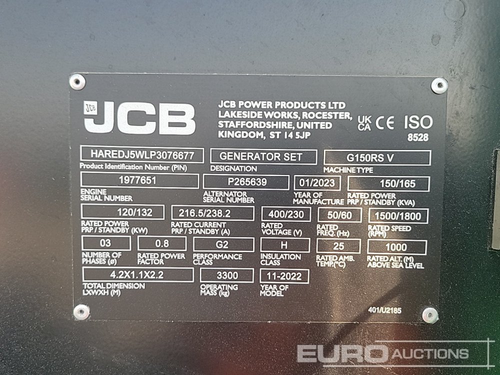 2023 JCB G150RS 165kVA Generator, 6 Cylinder Engine - 1977651