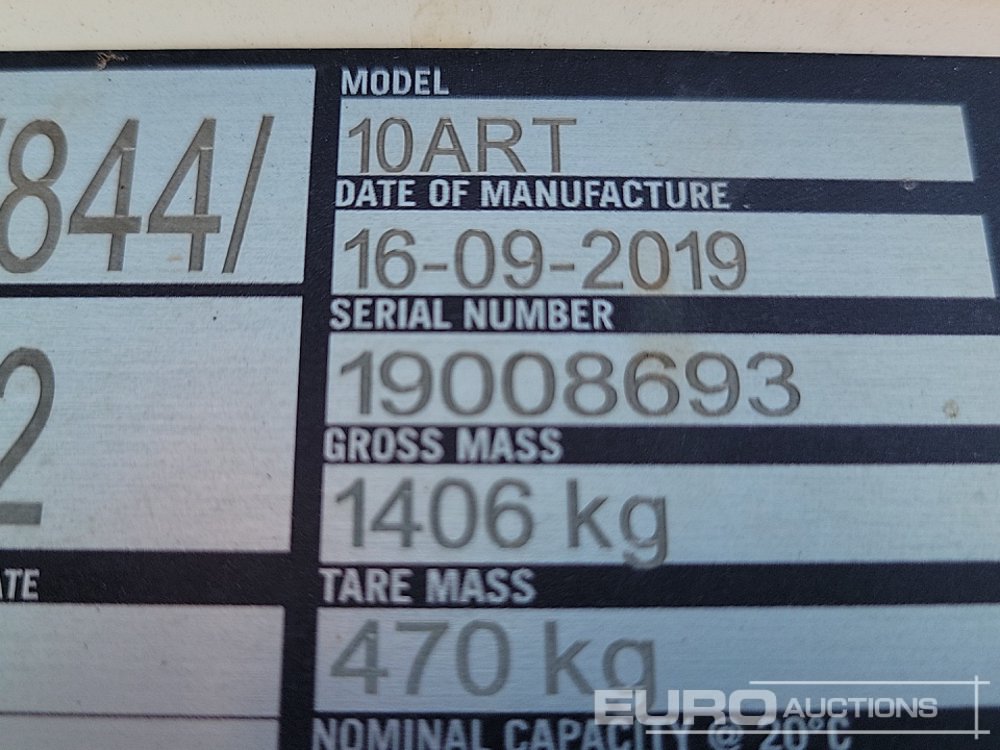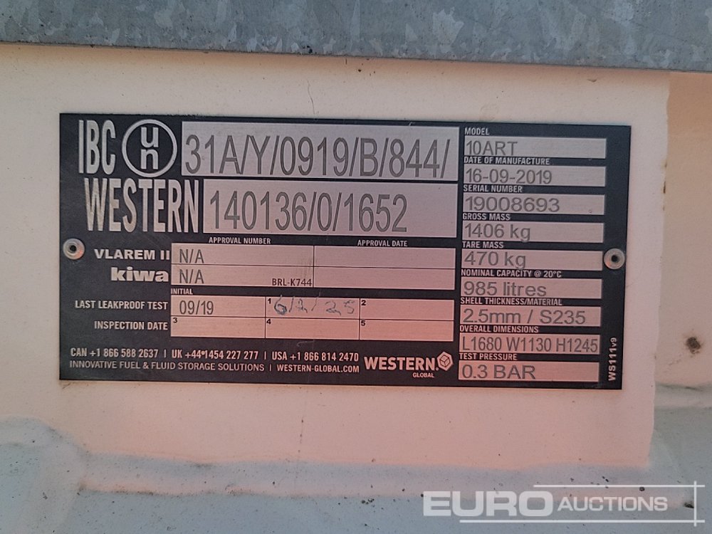 2019 Western Global 10ART 985 Litre Single Axle Bunded Fuel Bowser, Electric Pump - 19008693