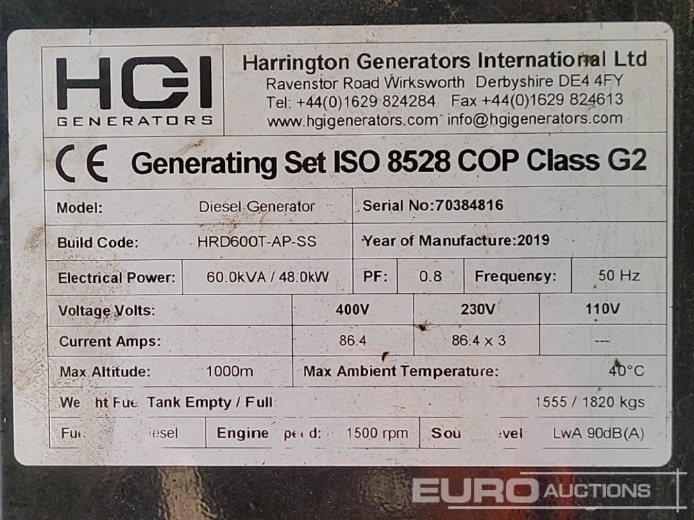 2019 HGI HRD600T-AP-SS 60kVA Generator, Perkins Engine (No Alternator) - 70384816