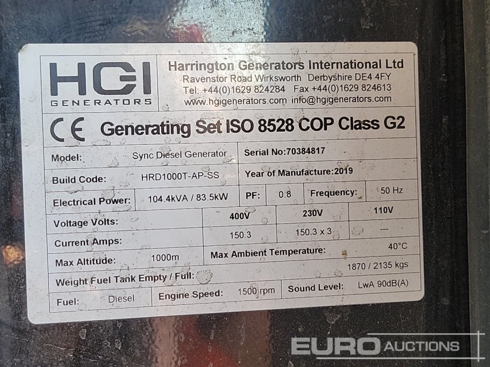 2019 HGI HRD1000T-AP-SS 104.4kVA Generator, Perkins Engine (Parts Missing) - 70384817