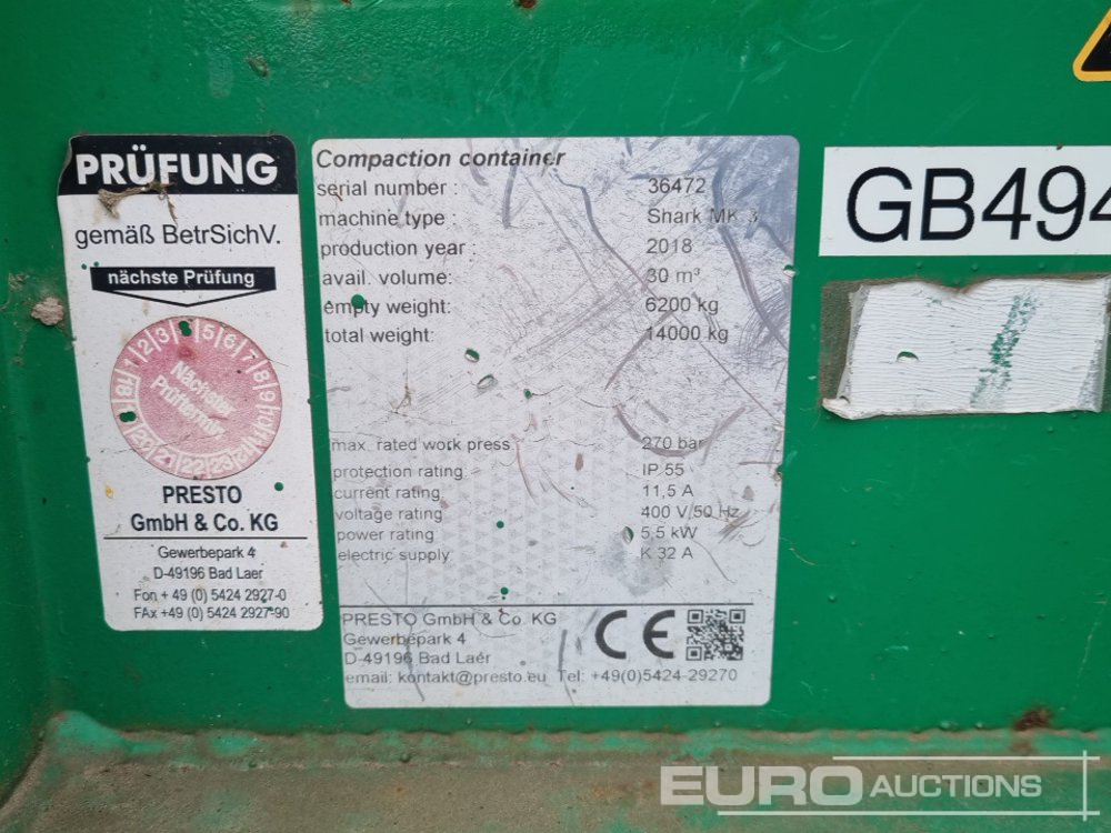 2018 Greenbank RORO Waste Compactor to suit Hook Loader Lorry - 36472