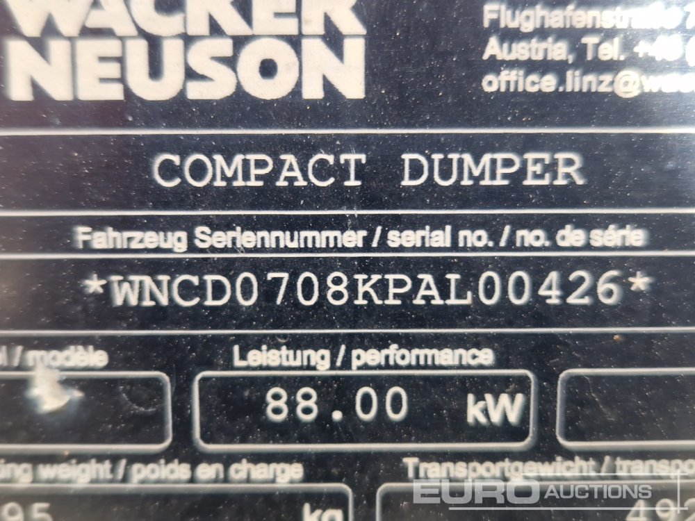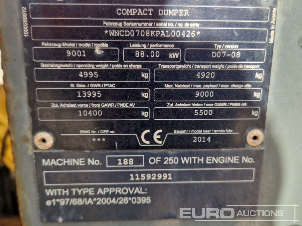 2014 Wacker Neuson 9001 9 Ton Dumper, Forward Facing, Full Cab - WNCD0708KPAL00426