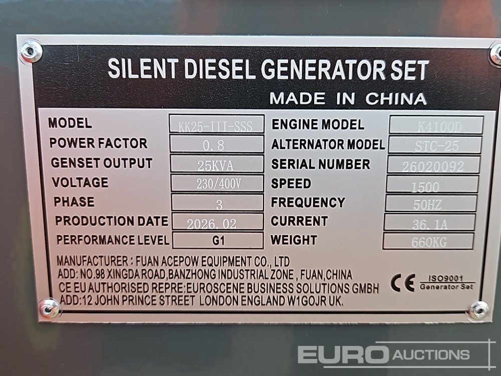 Unused 2026 Kawakenki KK-25-III-SSS 25kVA Generator, 4 Cylinder Engine - 140534493
