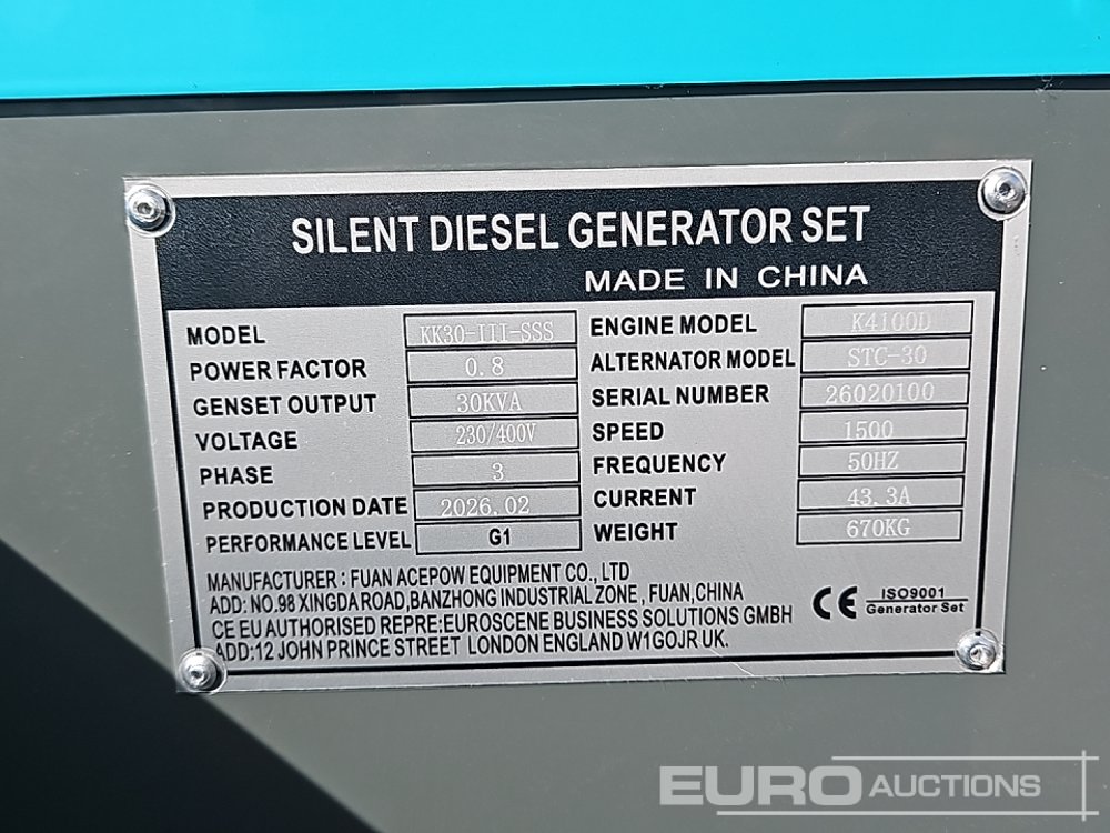 Unused 2026 Kawakenki KK-30-III-SSS 30kVA Generator, 4 Cylinder Engine - 140535501