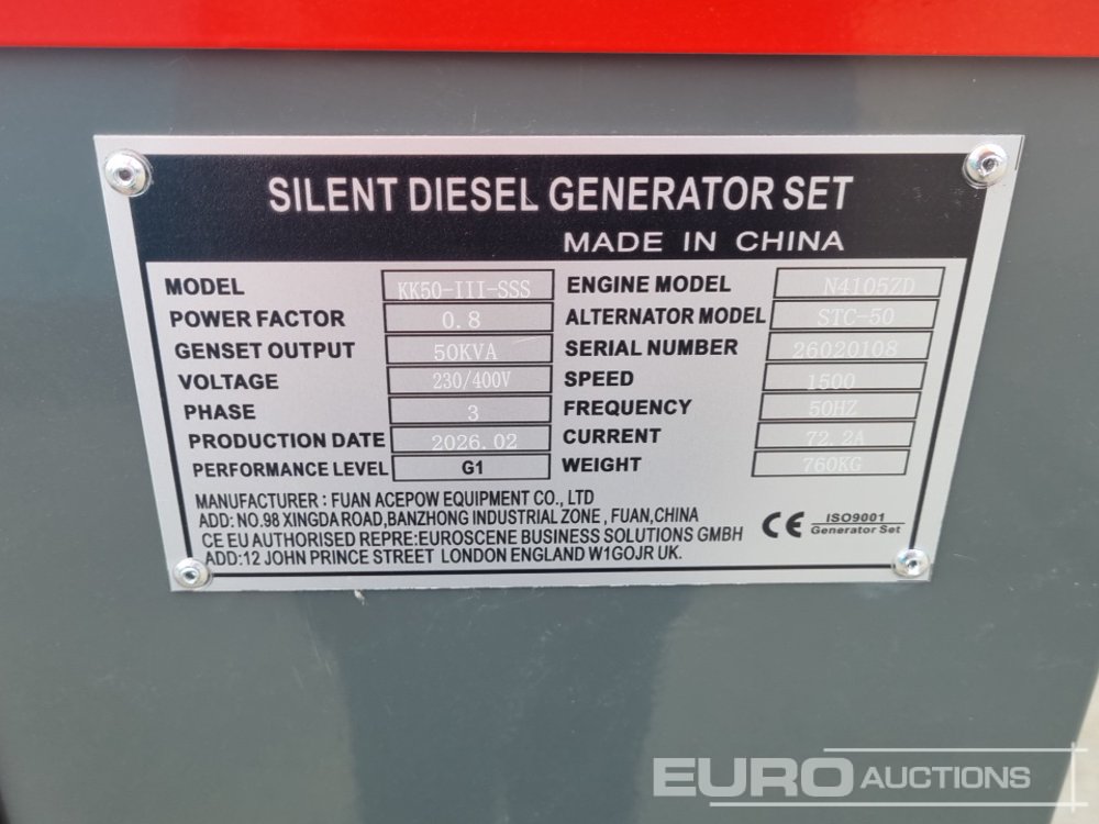 Unused 2026 Kawakenki KK-50-III-SSS 50kVA Generator, 4 Cylinder Engine - 140534510