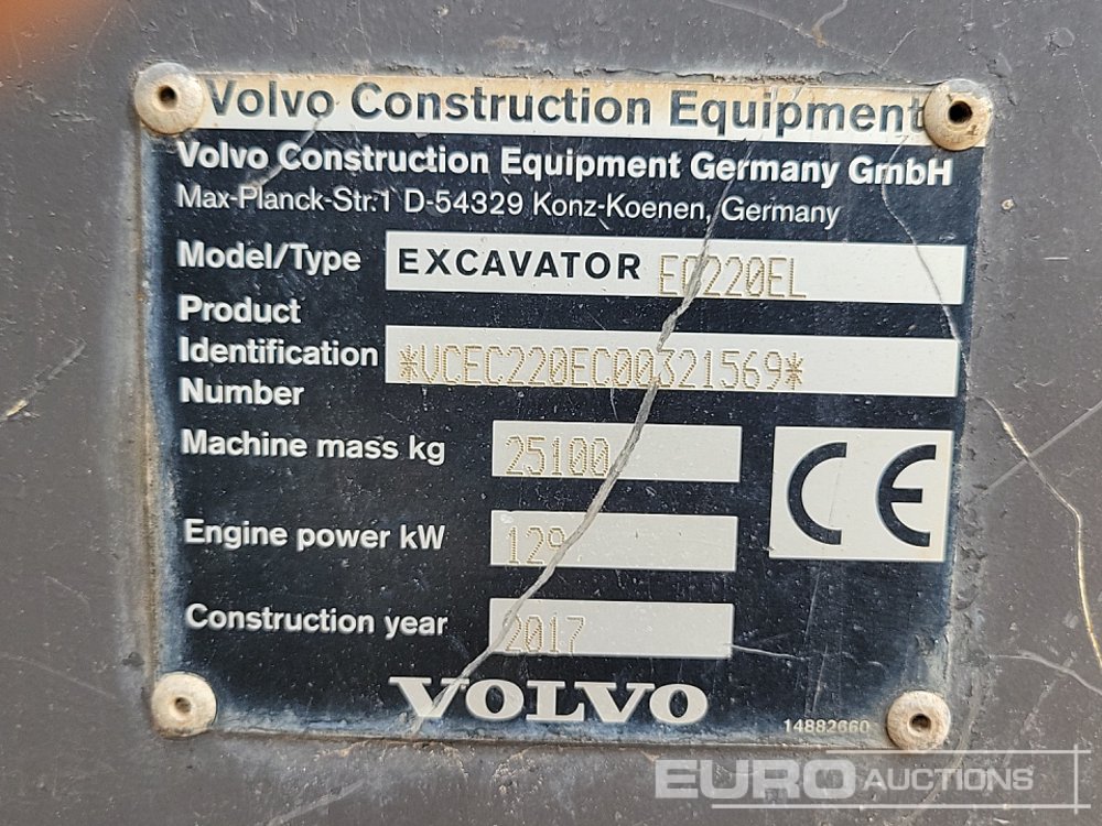 2017 Volvo EC220EL 600mm Pads, CV, QH, Piped, Aux. Piping, Demo Cage, 3 Way Camera, A/C - VCEC220EC00321569