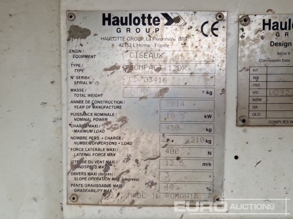 2014 Haulotte Compact 12DX Scissor Lift, 12.06m Working Height, 450kg Platform Capacity, Extending Deck, Non Marking Tyres - CD703416