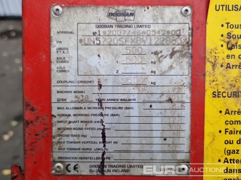 2011 Doosan 7/20 65CFM Single Axle Compressor (Meter Reading: 863 Hours) - UN5720SFXBY122853