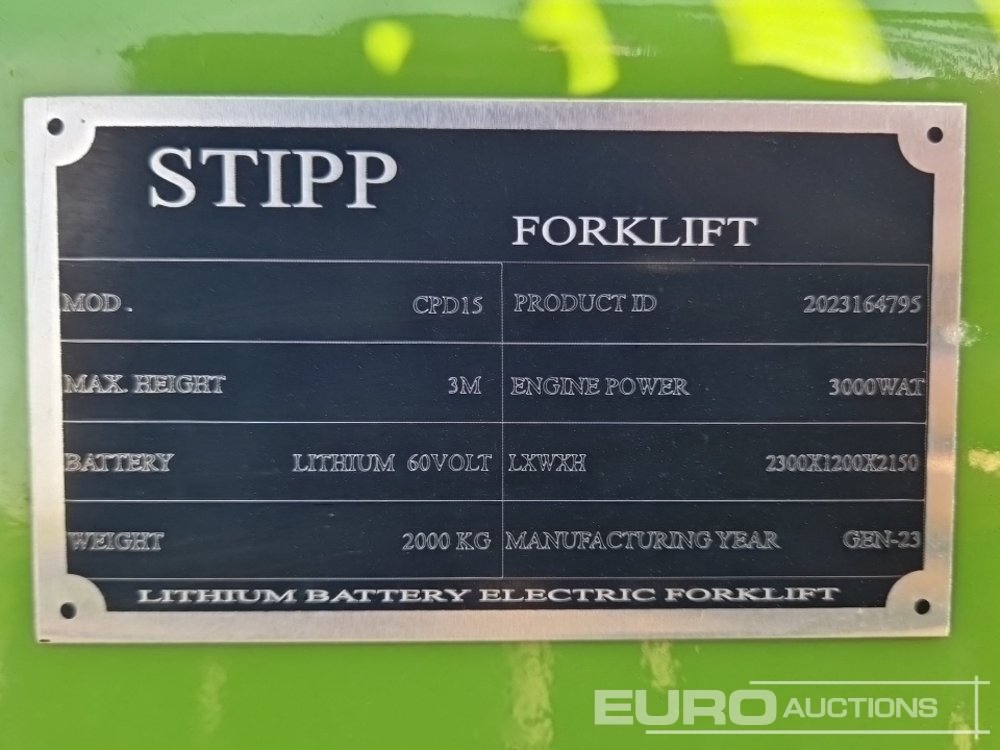 Unused Stipp CPD-15 Electric Forklift, 2 Stage Mast, Sideshift, Forks - 2023164795