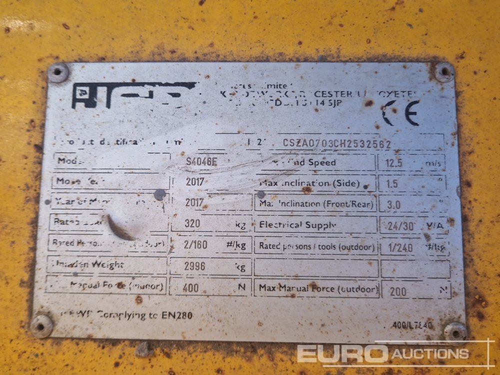 2017 JCB S4046E Electric Scissor Lift, 13.2m Working Height, 320kg Platform Capacity, Extending Deck (Copy of Declaration of Conformity Available / Copia de CE Disponible) (Meter Reading: 353 Hours) - CSZA0703CH2532562