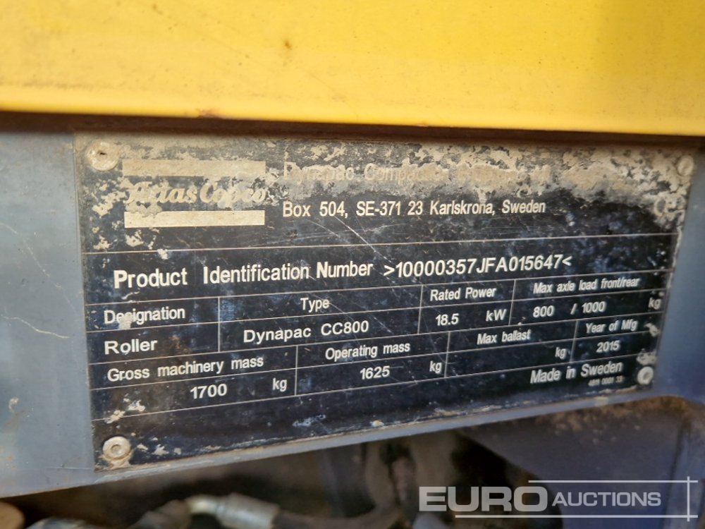 2015 Dynapac CC800 Double Drum Vibrating Roller, Roll Bar (Meter Reading: 484 Hours) - 10000357JFA015647