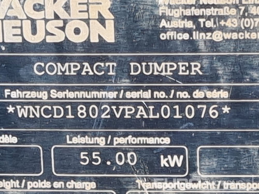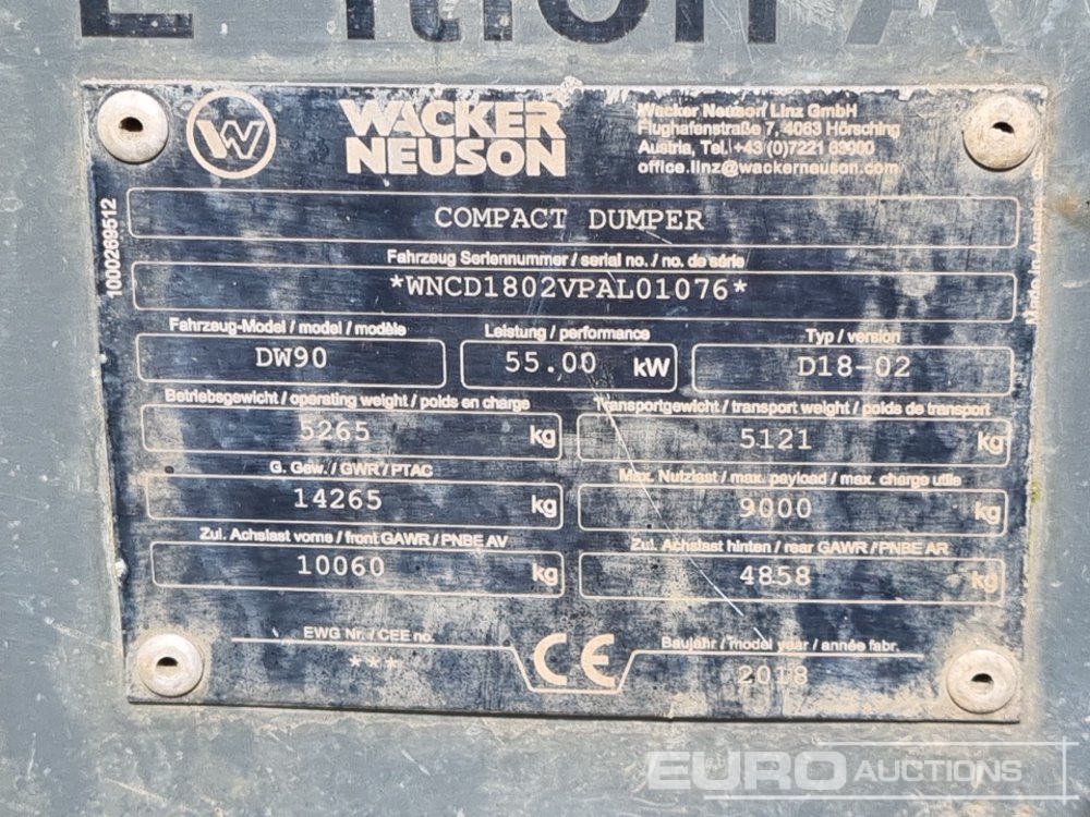 2018 Wacker Neuson DW90 9 Ton Dumper, Roll Bar - WNCD1802VPAL01076