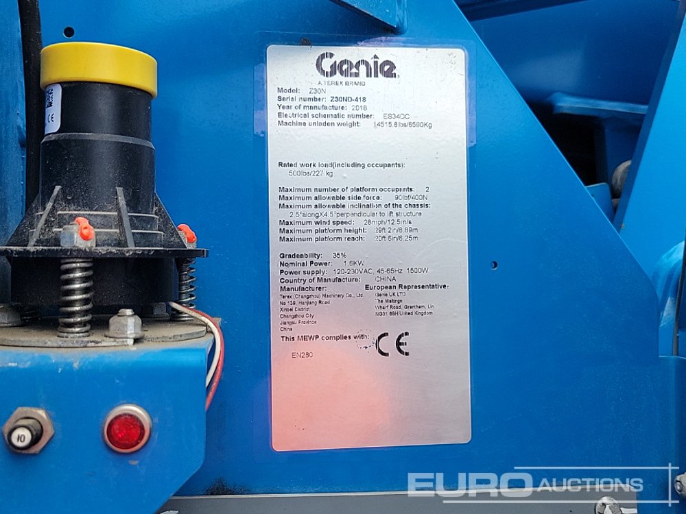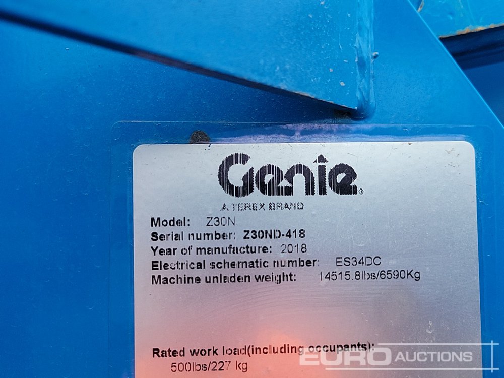 2018 Genie Z30N Electric Articulated Boom Lift, 11.1m Working Height, 227kg Platform Capacity, Non Marking Tyres (Meter Reading: 217 Hours) - Z30ND418