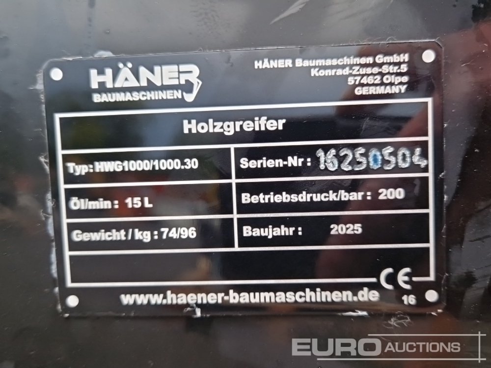 Unused Häner HWG1000.30 Rotating Wood Grapple to suit 2.5-4.0 Ton Mini Excavator, Closing Force: 10kN, Opening Width: 1,020mm, max. Lifting Power: 1500kg, Weight: 96kg - 16250504