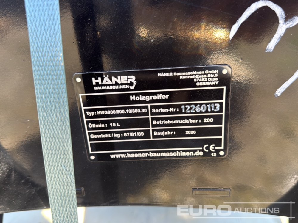 Unused Häner HWG800 Wood Grapple (without Rotator) to suit 1.5-4 Ton Excavator, Opening Width: 820 mm, Closing Force: 6.3 kN, max. Lifting Power: 600 kg, Weight: 67 kg - 12260113