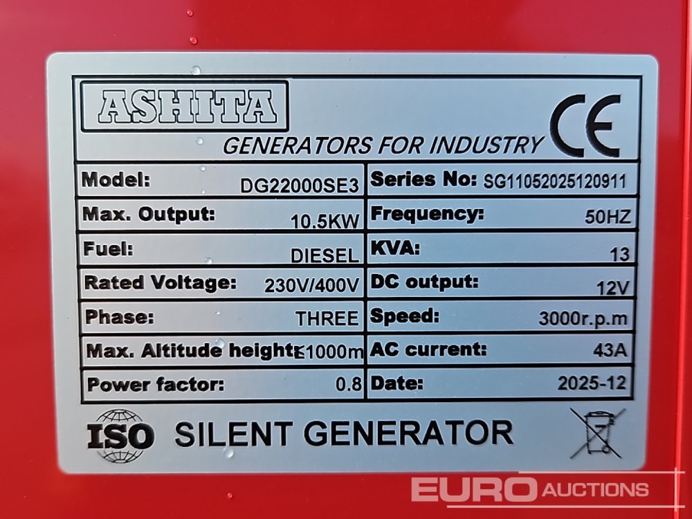 Unused 2025 Ashita Power DG22000SE3 12kVA Generator, Single Cylinder Engine - SG11052025120911