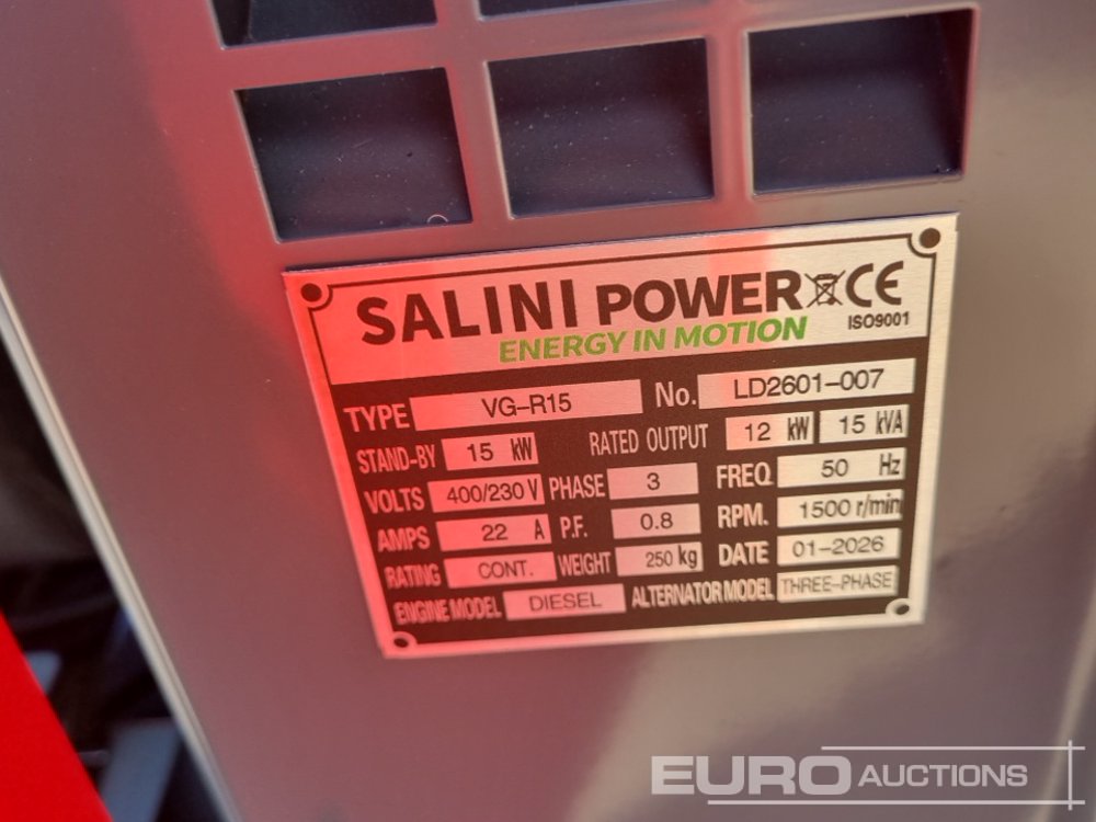 Unused 2026 Salini VG-R15 15kVA Generator, 1 Cylinder Engine - LD2601007